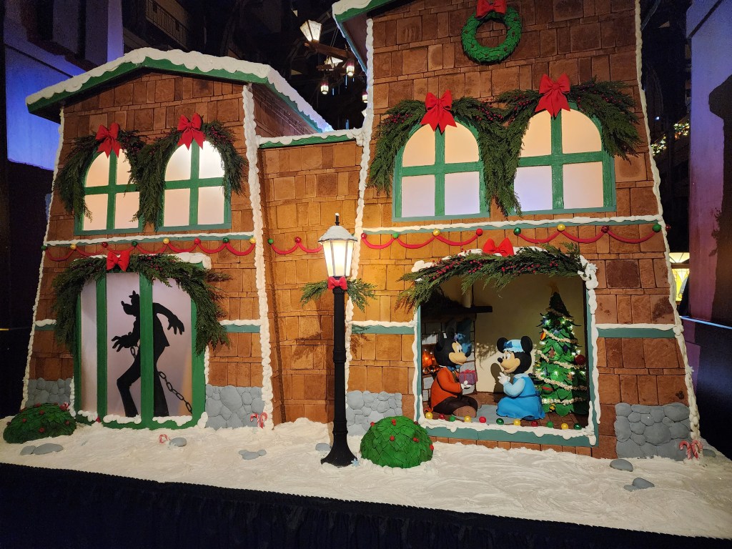 At this moment, it was time to head over to the Grand California Hotel to see the lobby all decked out. More importantly, to see the gingerbread house that was built that year. It was themed after Mickey’s Christmas Carol (one of my favorites as a kid, but the Muppet’s Christmas Carol is still better, sorry Disney). While there, we checked out the little treat cart next to it for a couple items before braving the downpour back to the Fiddler and Feifer cafe where we had left my dad and husband.