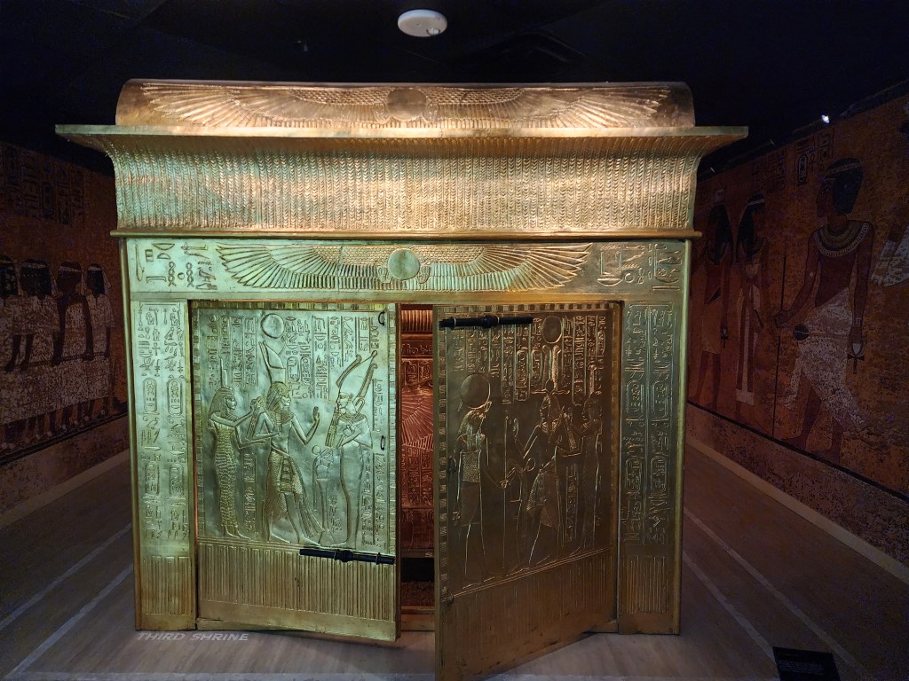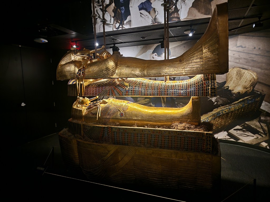 From there, you are guided through the exhibit and get to see real and replicated items from the tomb. Including an exploded view of the multiple sarcophagi that he was buried in. There’s even a replica room of what the burial chamber looked like with hieroglyphs and all. Following through, it also shares information about each item and some explain in further detail the relevance of why the item was placed in the tomb. It all ends with a look at a replica of the golden death mask and, of course, the gift shop.
