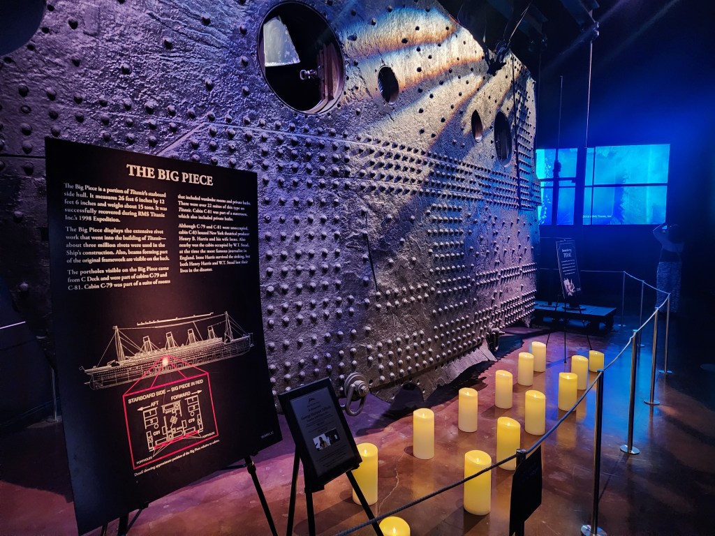 While this may appear that this is the end of the exhibit, it is not. This room showing the model of how the ship was found on the ocean floor, leads to a narrow hallway with more artifacts that were recovered. Exiting the hallway leads you to what they nicknamed “The Big Piece”. A large section of the hull was recovered back in 1998. It is 26 feet 6 inches by 12 feet 6 inches and the approximate weight is 15 tons. Walking into the room leaves you in awe at the size of this piece and brings you back to reality that this was a real tragedy where so many had lost their lives. We were visiting in April 3 days after the anniversary of the sinking and the museum had candles set out in remembrance of those who perished.